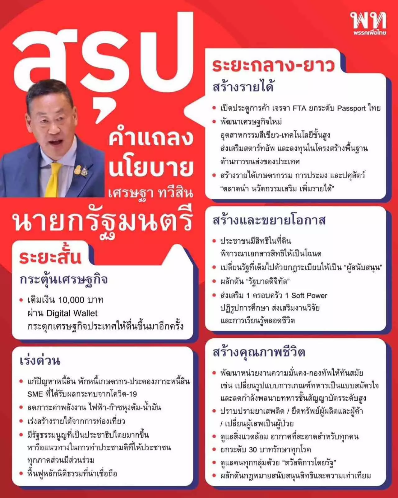 นายกฯ นำคณะ ครม.แถลงนโยบายรัฐบาล ยันดำเนินการเร่งด่วน 5 นโยบาย เงินดิจิทัลหมื่นบาท-พักหนี้เกษตรกร-ลดราคาพลังงาน-สร้างรายได้ท่องเที่ยว-ลดขั้นตอนทำวีซ่า พร้อม ยืนยัน แก้ รธน.แต่ไม่แตะ หมวดสถาบัน